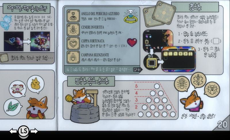 Tunic è un’avventura dal gameplay classico che presenta però un elemento di forte originalità: le pagine del manuale di gioco, fondamentali per comprendere il funzionamento degli artefatti o per orientarsi tra le varie sezioni della mappa, vengono recuperate durante il gioco stesso e sono, almeno inizialmente, scritte in una lingua incomprensibile.